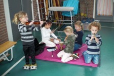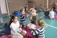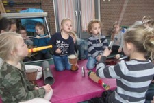 Zoƫ, Valentijn, Lina, en Jalila maken olifantenmuziek.