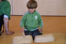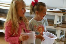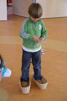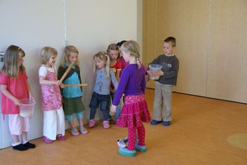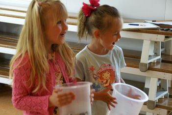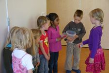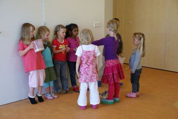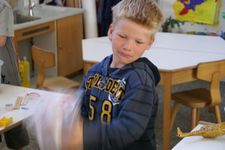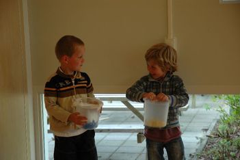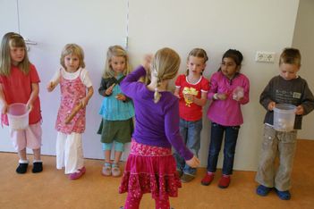 Wesly heeft een ‘klapper' van AZ meegenomen. Dat is grappig! Daar komt geluid uit... Eerst gingen we in de kring het geluid maken met kapla houtjes. Hierna mochten de kinderen andere materialen zoeken waar je geluid mee kan maken. Er werden plakband en stenen gepakt, grote blokken die heel veel lawaai maakten als je die op de grond liet vallen. Maar als je ze op elkaar sloeg, dan maakte ze ook nog veel kabaal. Bij het vallen van de blokken maakte Jori en Daniek zich enorm bezorgd voor de kikkervisjes want die schrokken zich rot. Je zag de visjes echt schrikken.Sommige maakten hoge tonen en anderen lage tonen. Maar je kon natuurlijk ook de bakken met kraaltjes pakken en die heen en weer bewegen. Dat gaf weer een heel ander geluid. Ella bedenkt dat je het piepschuim tegen elkaar aan kunt wrijven. Ze stond erbij te swingen. "Het sneeuwt!" riep er eentje toen de piepschuim uit elkaar viel. Het lokaal werd gevuld met verschillende geluiden. Irma pakte de djembe en ging daar ritmisch op slaan. De kinderen werden aangetrokken door het geluid en kwamen in de kring waar ze meegingen doen in het ritme.Toen ieder kind een geluid had gevonden gingen we naar de speelzaal. Daar gingen we in een kring zitten en met zijn allen onze geluiden laten horen. We probeerden om soms heel veel geluid te maken en soms heel weinig. Nu mochten de kinderen groepjes maken om samen geluiden te maken. Gingen ze dan alle geluiden tegelijk doen of naar elkaar luisteren? Het werden verschillende groepjes. Het groepje van Romy ging als een echt orkest waarvan Romy dan de dirigent was. Het groepje van Enya maakte prachtige zachte geluiden.De kinderen genoten allemaal zichtbaar. Sommigen namen de geluiden met hun lichaam op en gingen mee bewegen op het ritme.