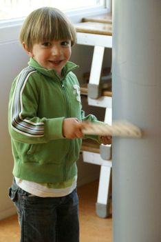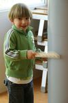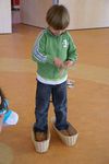 Coen heeft twee mandjes naast elkaar en een blokje erop gelegd zodat je een 'brug' ziet. Hij tikt met ander stokje op het blokje. "Ik heb een brugliedje"