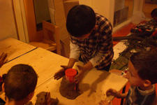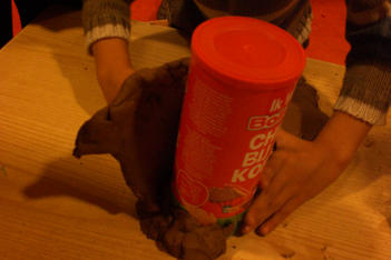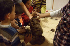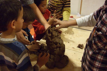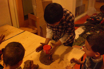 Samen maken verschillende jongens een vulkaan. Ze duwen de klei op elkaar, zo hoog mogelijk, zonder verbaal overleg. Het kleiwerk moet de lucht in, zo hoog mogelijk! Wel tien keer is er een gat in de vulkaan gemaakt dat vervolgens door een ander werd dichtgestopt. Anuouar zat rustig bolletjes te maken. Jonathan maakte slangetjes.