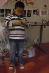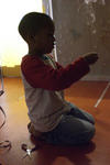 Na het licht-experiment gaan de kinderen op verschillende plekken in het atelier aan de slag. Gianni en Zakaria werken aan hangende rook.