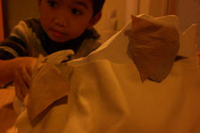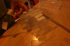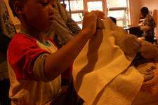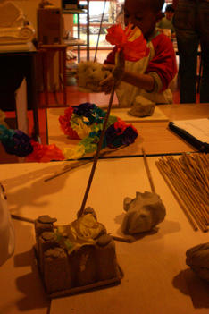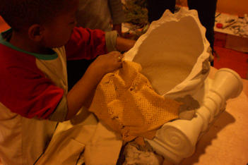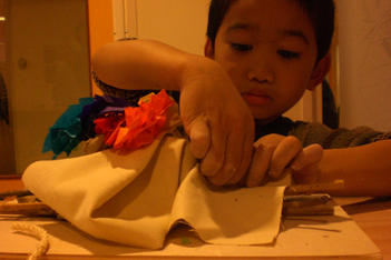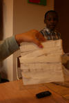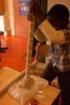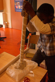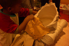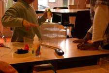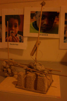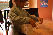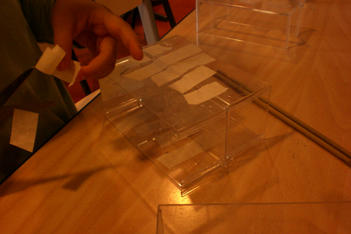 Alledrie kiezen de kinderen doorzichtige plastic doosjes en bamboestokjes om mee te werken. Amancio en Nadim verliezen hun interesse. Serena werkt aan tafel stug door, eerst met lijm en later met plakband om de doosjes te verbinden.
