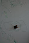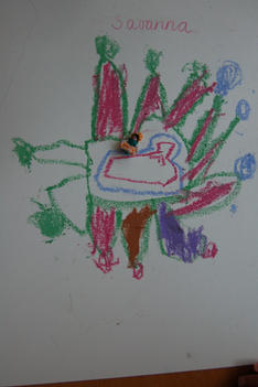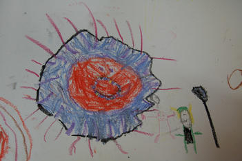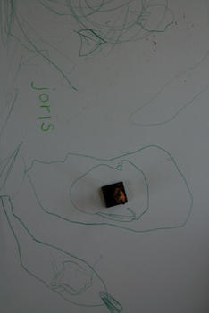 SavannaJoris kiest van de spiegel een warhammerpoppetje (een klein 'gevaarlijk'mannetje met horens op zijn hoofd). Hij weet er niets over te vertellen maar kijkt er wel vol bewondering naar. Myo zegt: 'Het lijkt wel een man een soort stierenman. Ik weet wat, wat een collega zegt tegen mij: hij heet esquorn'.Joris begint al pratend te tekenen. Hij houdt zijn potlood helemaal aan het uiteinde vast en beweegt hem eerst als een veertje boven het papier, dan raakt het potlood het papier en worden de lijnen steeds dikker en de beweging groter: 'Hier kom je bij Helledoorn. Moet je zo de weg gaan, dan moet je zo de weg gaan. Dan moet je zo hard als deze weg gaat. Dan kom je bij Hellendoorn'.Hanneke