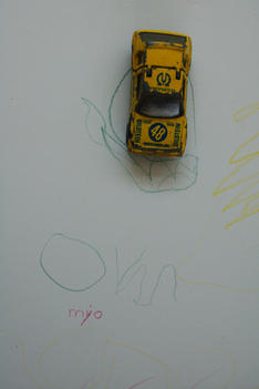 'Ik heb een auto met geel. Kijk zo: (de achterkant kan open). Die glijdt uit'.