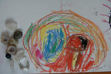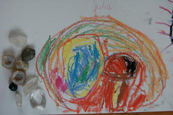 Julia legt bij binnenkomst meteen haar mooie edelstendoosje op tafel. Ze pakt er één uit die in tweeën is gedeeld. 'Dit is de apesteen' vertelt ze 'Hij kan gewoon uit elkaar. Zo is ‘ie neergelegd. (Ik heb ‘m) gevonden op de edelsteen tocht. Daar zat een hele grote grot vol met edelstenen. Daar vond ik zomaar een andere edelsteen.