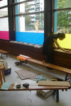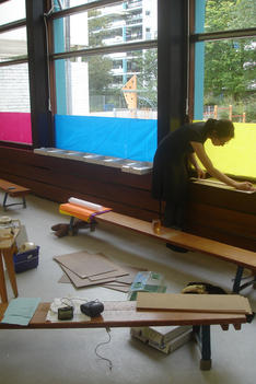 Deze inrichtingsdagen zijn intensiever dan ik had verwacht. Naast alle praktische zaken ontdek ik dat het enorm belangrijk is om tijd met elkaar door te brengen om samen een beeld te vormen van het project. Bij binnenkomst in het lokaal wachtte Berthe op ons. Ze zou ons komen helpen bij het project. We hadden van Joke al gehoord dat ze een klasse- assistent zou krijgen die haar op de achtergrond met allerlei hand en span diensten zou bijstaan. Na de kennismaking merkte ik dat ze er andere verwachtingen van had dan dat wij er van hadden. Ze bleek ook kunstenaar te zijn er heel geïnteresseerd in Reggio Emilia. Dit was een enorm dilemma. Vóór ons hadden we iemand die heel enthousiast en gemotiveerd is, alleen leek het ons niet goed voor het team om er nog een vijfde persoon bij te halen. We hebben haar laten weten dat we eerst met elkaar starten. Mocht blijken dat we echt handen tekort komen dan hopen we dat we alsnog een beroep op haar kunnen doen. Ze was enorm teleurgesteld. Het was lastig om een gemotiveerd iemand de deur te wijzen.