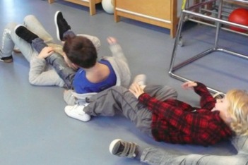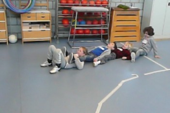 Tijdens het vrije werken waren de kinderen niet alleen met klanken, maar ook heel erg met de ruimte bezig. Ze gingen op de grond liggen of zitten, of maakten een beweging die vaak eindigde op de grond.