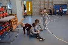 Eva Klee (team Toeval Gezocht) keek mee bij deze les. Het viel haar op dat de kinderen heel erg bezig waren elkaar te kopiëren toen ze, in groepjes verspreid door de ruimte, vrij aan het werk waren. Ook leken de meeste kinderen zeer verbonden met de grond – ze gingen op de grond liggen, of een beweging maken die op de grond eindigde.