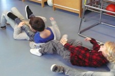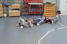 Het groepje van Nikki, Rambod, Enzo en Chakir experimenteerde met twee klanken die ze zelf bedacht hadden. Ze gingen verschillende vormen uitproberen: in groepjes van twee tegenover elkaar zitten. Dan met de voeten tegen elkaar. Uiteindelijk maakten ze een lange toren met z'n vieren, liggend op de grond in elkaar verweven. Nikki en Chakir maakten hetzelfde geluid (een plop met de vinger in de mond), en Enzo en Rambod maakten samen een ander geluid (brrrrr).