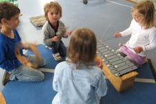We beginnen in de kring. Dan mogen de kinderen in groepjes vrij muziek maken.