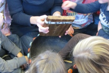 In een keurig rijtje en stil als muisjes sluipen we onder zacht getokkel van de mbira naar het speellokaal. De kinderen komen graag zo dicht mogelijk bij Debby en de mbira in de cirkel zitten. Iedereen mag proberen, Dexter als eerste. Eerst krijgt hij er geen geluid uit, maar dan wel. Dat is een beleving!