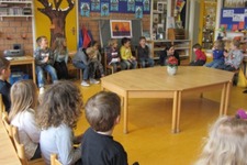 Toen Debby al spelend de klas binnenkwam zaten de kinderen geboeid op hun stoeltjes in de kring. Sommige kinderen gaan meteen lachen. Doris probeert mee te zingen. De mbira zit in een beetje verstopt in de calebas waardoor de kinderen niet meteen zien wat Debby doet. Al snel komen er vragen: