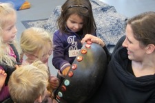Een paar kinderen weten het wel en willen het aan de anderen vertellen: 'Ik heb het gezien, er zit iets in!' 'Het is een schildpad!' 'Nee, er zitten zilveren dingetjes op hout, met je duimen doe je zo en dan komt er muziek uit'.