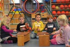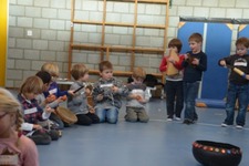 Gelukkig blijven niet alle kinderen bij hun groepje, maar worden er ook weer nieuwe groepjes gevormd. Op die manier krijgt het xylofoon groepje van Janna en Anouk bijvoorbeeld percussie begeleiding.