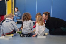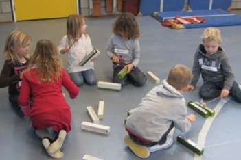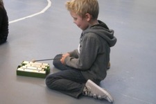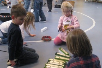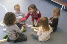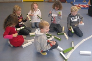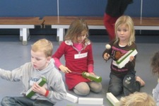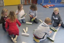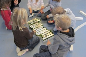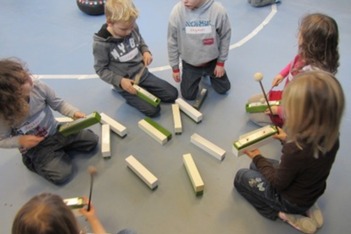 Het klankstaaf groepje bestond uit Doris, Mara, Ivan, Thijmen, Dexter en Janna v.d. S. Doris nam al snel de leiding en probeerde wat structuur te introduceren. Dexter zat naast haar met het stokje omgekeerd op een klankstaaf te slaan. Doris: ‘als je ‘m nou omdraait krijg je er een mooi geluid uit.'