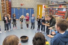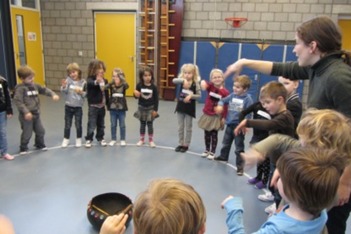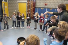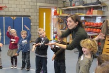 De kinderen doen enthousiast mee, allemaal tegelijk lukt niet echt.