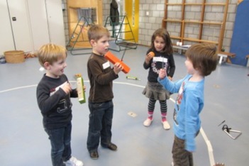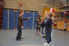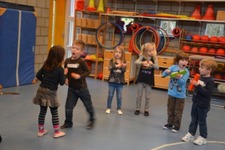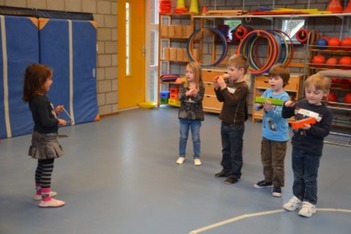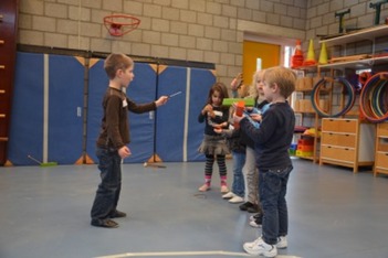 De kinderen dirigeren op verschillende manieren. 'Zoals het moet': met een stokje, staand voor de muzikanten. Of met grote bewegingen van de armen. Of met een sprong. Of met spreken.