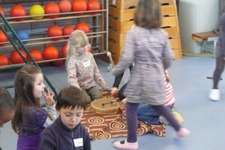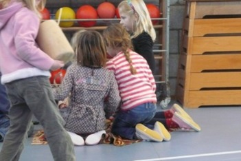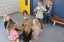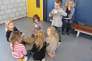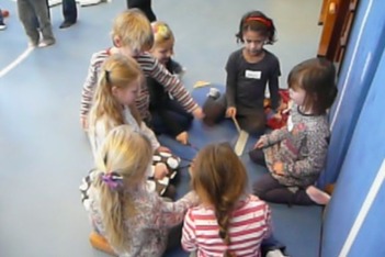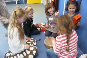 Evi heeft de tamboerijn ontdekt. Ze gaat er keihard op slaan met een stokje. Al snel vormt zich een groepje meisjes om haar heen, en ze gaan samen op de tamboerijn spelen. Keihard, dan weer wat zachter. Onder leiding van Evi en Fiep gaan ze door de hele ruimte: proberen hoe het ergens anders klinkt, of hoe het klinkt als je de trommel omhoog houdt, of juist op de grond of op een mat neerlegt. Aan het eind gaan ze op een kleedje spelen, dat ook nog werd verplaatst.