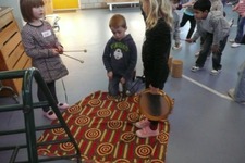 Al snel bleek dat de meisjes niet alleen keihard aan het trommelen waren, maar echt met een onderzoek bezig waren. Ze verkenden werkelijk de hele ruimte, bewogen van hier naar daar, streken soms ergens neer, of gingen juist op de bank staan om de tamboerijn nog hoger te kunnen houden. Uiteindelijk werd het kleedje heel belangrijk voor hun samenspel. Toen ze aan het eind hun stuk mochten presenteren deden ze dat ook op het kleedje.