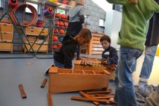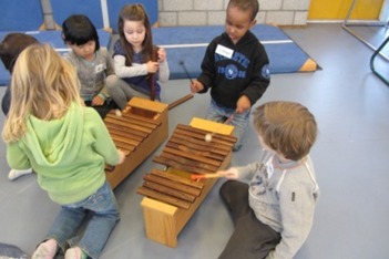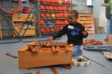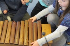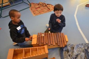 Andere kinderen komen af en toe kijken of meespelen, maar de twee jongens vormen de harde kern. Ze halen de xylofoons helemaal uit elkaar. Zetten alle toetsen er weer op in een andere volgorde. Kijken wat er gebeurt als je de toetsen omdraait. En proberen of ze ook aan de binnenkant van de xylofoon kunnen spelen.