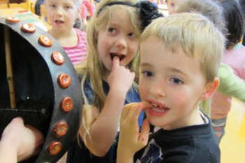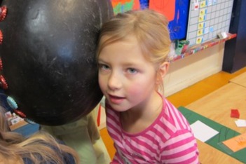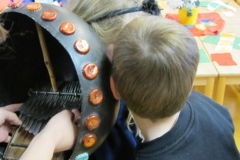 Debby staat bij de deur. Iedereen die klaar is mag in een rij bij haar komen staan. Job, Lieve en Elina staan heel dichtbij en leggen hun oor op de calebas of raken hem aan. Dat is hard! En het trilt. Job merkt op dat er allemaal flesdopjes in verschillende kleuren opzitten.
