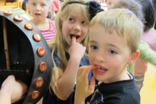 Stil als muisjes gingen we naar het speellokaal, waar de 'muziekles' uiteindelijk een half uur later dan gepland begon.