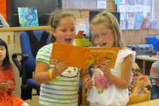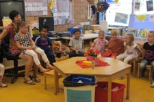 Marcela en Angel hebben samen ook nog een verrassing voor ons: zij hebben samen "Ik heb een tante in Marokko..." ingestudeerd. Ze staan samen in het midden van de kring, en houden het liedjesboek vast tijdens het zingen. De andere kinderen zingen mee.