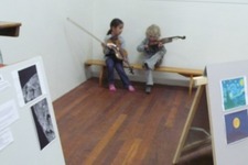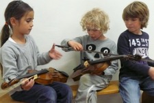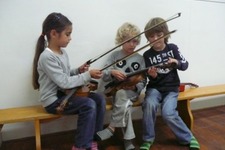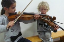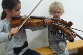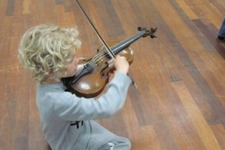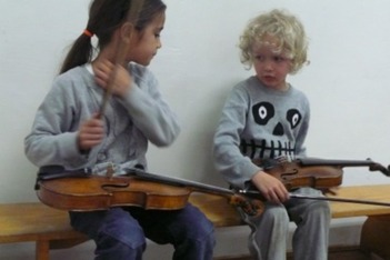 Het is opvallend dat we vooral het ritme van de muziek kunnen horen. Van verschil in toonhoogte is nog geen sprake. Dat komt waarschijnlijk vooral doordat de violen eigenlijk te groot zijn voor de kinderen. Jade lijkt de muziek te sturen. Hein volgt haar.