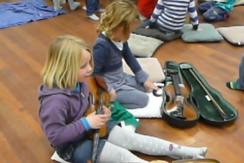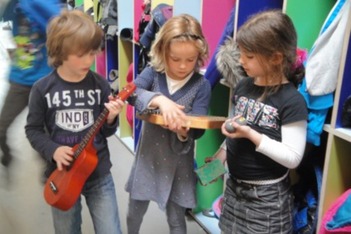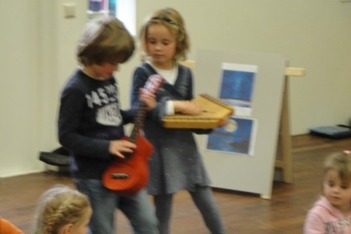 Wanneer zij aan de slag gaan, spelen zij op allerlei verschillende instrumenten: viool, ukelele, fluit. Op de gang bereiden zij hun lied voor. Het is een lied voor de hele klas.