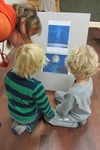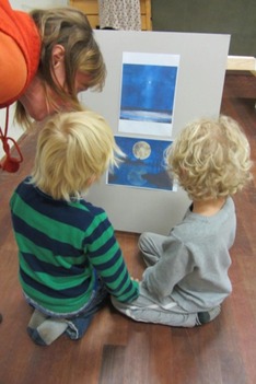 In het kringgesprek reageerden de kinderen sterk op wat ze zagen op de afbeeldingen. Toen Emma vroeg wat ze in de ruimte konden zien werd er veel gezegd over de maan. Er was een grote betrokkenheid bij de kinderen.