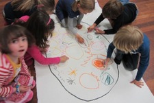 Het groepje van Kenai, Silke, Koen, Emma, Lisa en Maud tekent een maan.