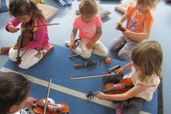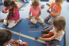 Bibi en Emma mogen een instrument kiezen. Als het vrije werken begint zitten ze eerst met Luce, Faye en Daliya in een groep. Al snel hebben ze alle twee een viool en gaan ze als duo verder. Ze staan tegenover elkaar en beginnen met een muzikaal gesprekje. Om hen heen is er behoorlijk wat herrie, maar ze zijn de hele tijd zo geconcentreerd bezig dat ze dat helemaal niet lijken te merken. Emma neemt het voortouw en speelt iets op de viool. Daarna wacht ze tot Bibi het naspeelt. Ze kijkt verwachtingsvol naar Bibi en als die het nog niet helemaal goed heeft herhaalt Emma hetzelfde nog een keer en zegt “nee, zo!”. Emma heeft in het begin de strijkstok verkeerd om vast maar dat lijkt helemaal niet uit te maken. Ze is heel precies in de muzikale frases die ze speelt.Bibi moet deze zo nauwkeurig mogelijk naspelen. Bibi kijkt oplettend en probeert het te kopiëren.