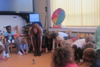 Iris: "Deze mag vanaf vandaag iedere dag met iemand mee naar huis. Juf Iet hangt een lijstje op, waar hij is en wie er aan de beurt is. Maar waarom gaat deze mee naar huis? Wat heb ik jullie gevraagd de laatste 2 keer?"