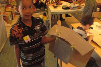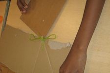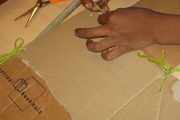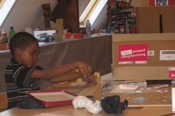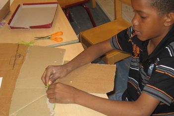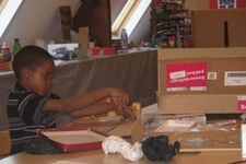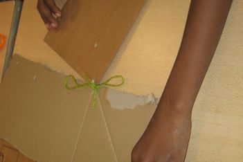 Chivaro heeft mij al meer verbaasd met zijn fijne motoriek. Als hij na het schetsen aan de slag gaat probeert hij een techniek uit, die ik hem heb laten zien. De kinderen zijn nog niet verder gekomen met plakken, plakband en timmeren om twee delen aan elkaar te maken. Een touwtje om iets vast te knopen komt dan goed uit. Zonder problemen maakt Chivaro een "íets" wat op deze manier aan elkaar komt. Naderhand schildert hij het grijs. Echt iets voor Chivaro. Hij houdt van kleuren mengen en schilderen.