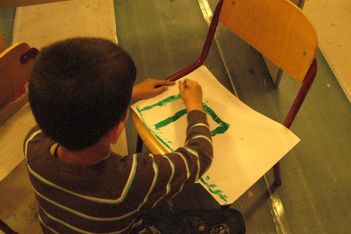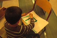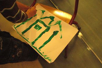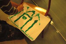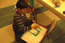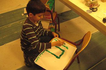 Dit was zijn tweede activiteit. Heel informeel en terloops gaat hij zitten bij de tafel. Pakt een stuk papier en legt deze op de stoel voor hem.Dan gaat hij schilderen alleen met groen verf. Ik neem aan dat hij de groen verf heeft ontdekt, die anderen hebben gebruikt om hun harnas te schilderen. Nikola heeft groen gebruikt. Er was nog wat over in een bakje.