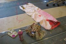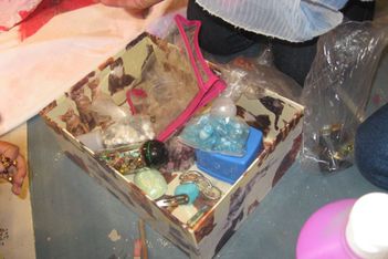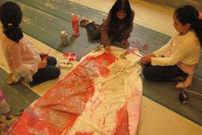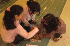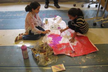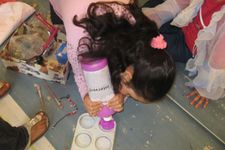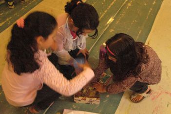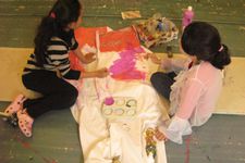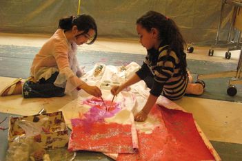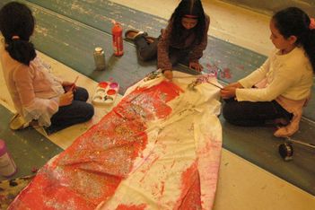 Er zijn voor de kinderen glitter en kleine versieringen meegenomen. Dit geeft weer nieuwe mogelijkheden en nieuwe moed. De jurk is groot en de kwasten zijn klein. Op een goed moment komt Sumeyra Hajar helpen en tegen het eind van de middag is met nog meer hulp de jurk haast helemaal beschilderd en versierd.