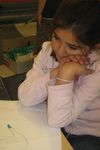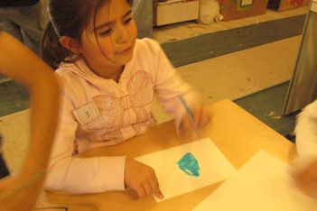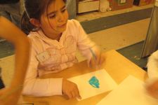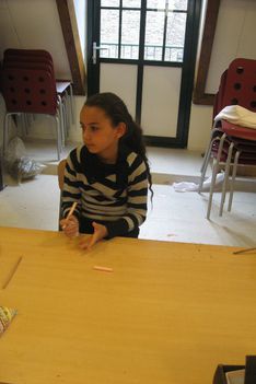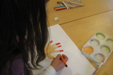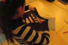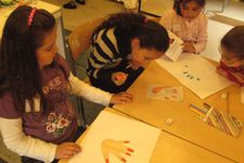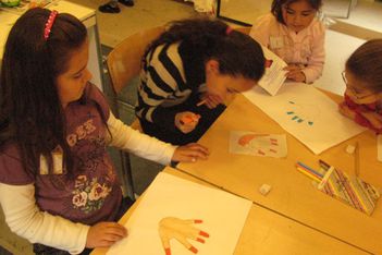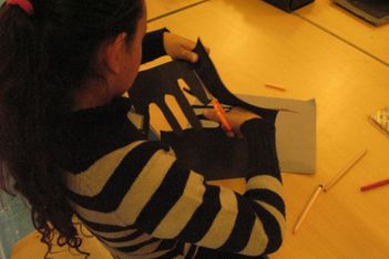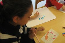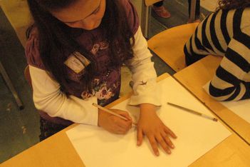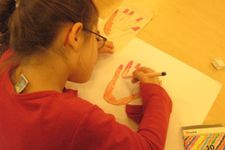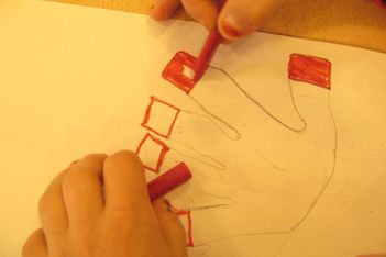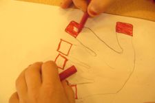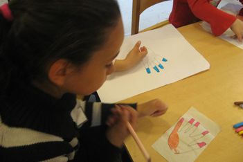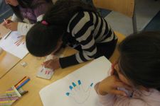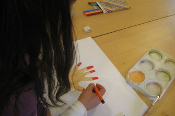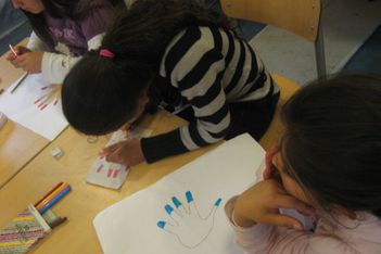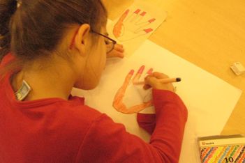 Ze legt haar hand op een stuk papier en tekent de omtrek na. De anderen doen dit ook. AlleenĀ Esma twijfelt of ze het wel kan, maar ook haar lukt het. De hand wordt gekleurd en uitgeknipt.