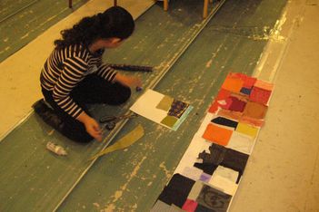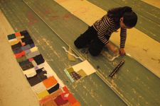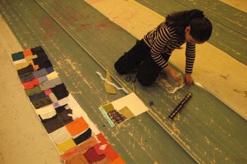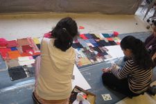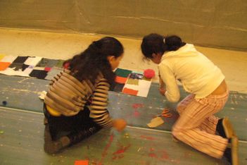 Ilham is vandaag weer door gegaan met haar textielschilderij. Eerst werkte ze alleen, later met kleine Ilham. Deze vroeg of ze mocht meehelpen.