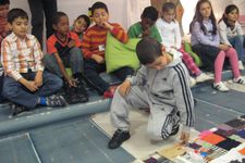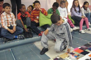 Bij de nabespreking laat ze haar werkstuk zien en wil dat ieder kind komt voelen aan de verschillende texturen.