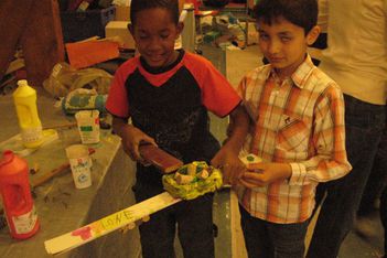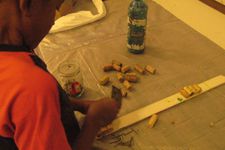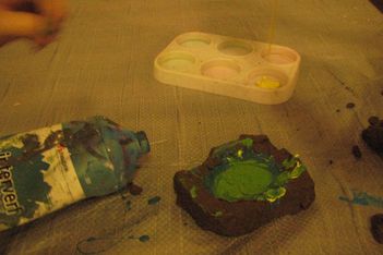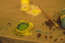 Als de vorm naar zijn zin is wordt deze eerst met een groene kleur geschilderd. Daarna wordt deze overgeschilderd met geel.
