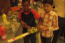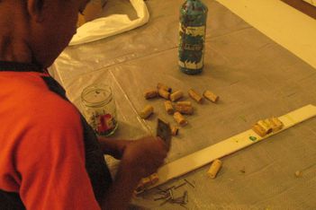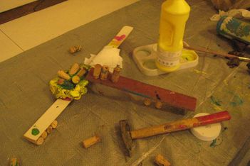 De springplank is van hout. De kurken stellen mensen voor. De kurk met een spijker er in is een robot. Die kan niet het water in, want dan ontploft hij! Het bad zit vol met mensen ( kurken ).