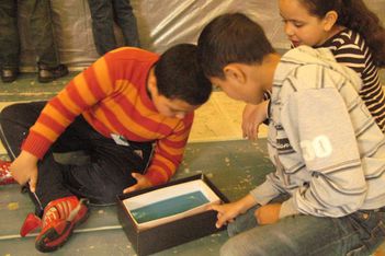 Nu wordt een nog grotere doos gepakt en op de zelfde manier opnieuw met blauw water gevuld.