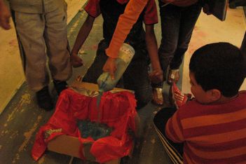 De vier jongens onder leiding van Mo pakken een schoenendoos en vullen deze op zelfde manier met blauw water. Enes en Ouassim pakken de doos in met tape, maar deze gaat lekken en moet worden weggegooid.