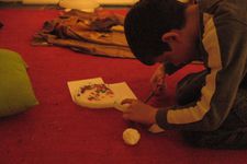 Dat doet hij nu ook. Het kost veel moeite het racket en de bal uit de kunststofplaat te knippen. Het lukt uiteindelijk. Hij ziet dat de waterachtige verf niet goed hecht op de kunstof. De verf krakeleert er af.