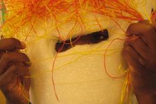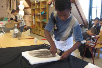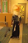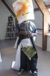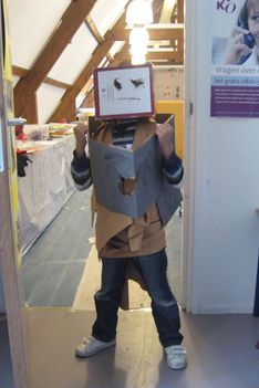 Wassim en Ouassim vormen hun riderpak uit lappen stof, die ze om hun heen knopen. Enes heeft een heel eigen pak van karton gemaakt met helm.