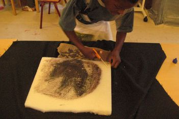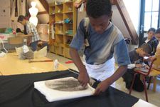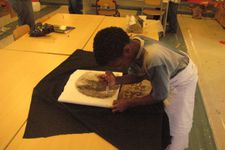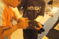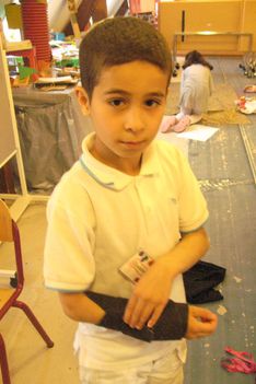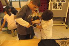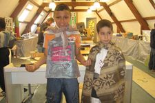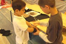 Een van de jongens van groep 6 (ze zijn te gast bij ons voor een keer) werkt samen met Enes, Wassim en Ouassim aan polsbeschermers voor de ridders. Het materiaal is vloerbedekking, die makkelijk buigzaam is. Ze worden vastgeplakt met tape en lijm, maar dat laaste is geen succes.