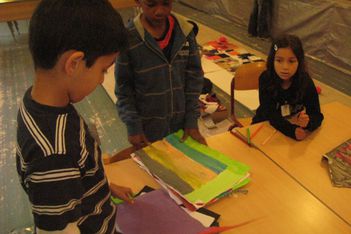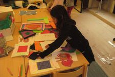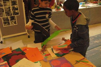De twee grote opgespannen spieramen zijn mondjesmaat gebruikt om kosteloos materiaal of speciaal meegenomen keuzes van de kinderen een plaats te geven. Willem vraagt aan de kinderen of we deze plek mooier kunnen maken met werkstukken,die in het atelier gemaakt zijn.