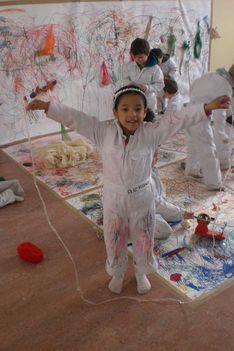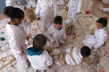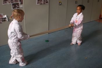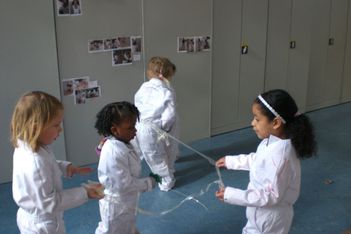 De kinderen zijn volop aan het testen wat er allemaal kan met plakband. Hoe ver kan het uitgerold worden?