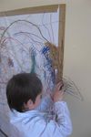 Roel heeft een tak en wil deze op het kunstwerk plakken. Maar dat gaat niet, hij heeft geen plakband. Hij haalt plakband los dat hij de vorige keer op de muur heeft geplakt en gebruikt dit. Wanneer we het einde van het werken in het atelier in zicht is, knipt Roel nog gauw een gat in het kunstwerk.