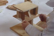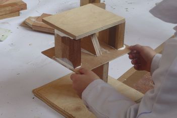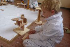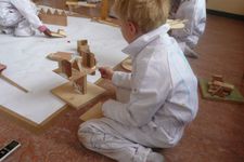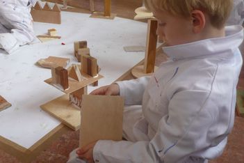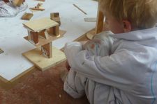 Paul heeft van houten blokjes een kunstwerkje gemaakt. Hij zit ernaar te kijken terwijl hij wacht.
